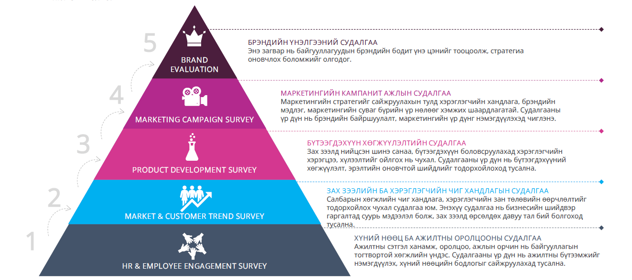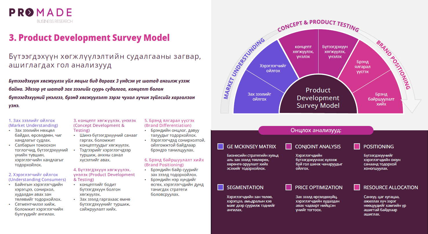 Бид байгууллагын дотоод дата өгөгдөл, хэрэглэгчийн зан төлөв, сэтгэлзүйн судалгааг уялдуулан шинжлэх арга зүйг санал болгодог. Энэхүү хосолсон шинжилгээ нь олон төрлийн эх сурвалжид тулгуурлан, хэрэглэгч төвтэй шийдвэр гаргахад тань дэмжлэг үзүүлнэ.